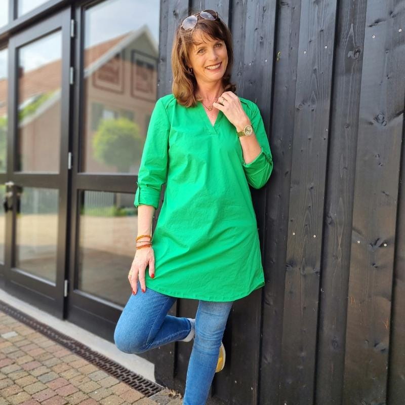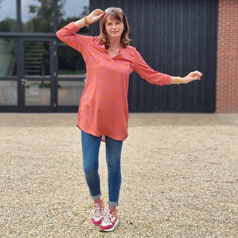 Die pepelinchen Tunika ist ein lässiger Schnitt, den Du in zwei Längen nähen kannst. In der langen Version lässt sich die Tunika gut zu Hosen oder Leggings kombinieren für einen schönen, sommerlichen Look. In der kurzen Blusenvariante kannst Du sie gut zu einem sportlichen Outfit kombinieren. Besondere Details sind der schöne V-Ausschnitt, die Paspeln im Vorderteil, die Du natürlich auch im Muster/Farbmix als Kontrast gestalten kannst, und die lässigen Ärmel, die mit geknöpften Riegeln auf 3/4 Länge getragen werden.